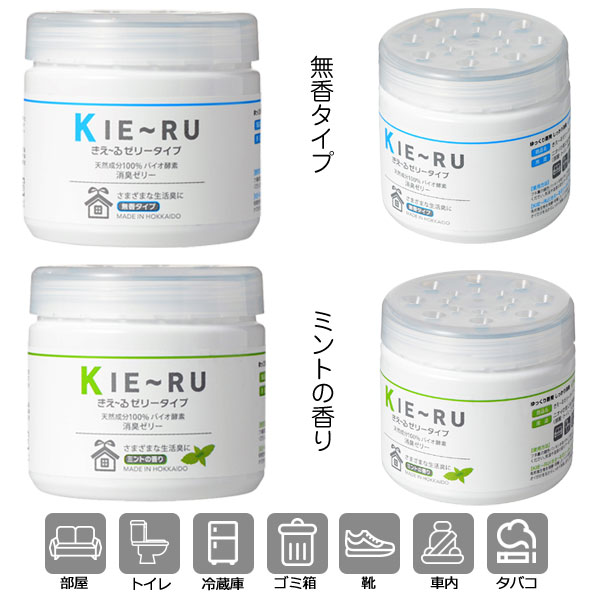 サイズ:直径6.4×高さ6.2cm 成分:バイオAW(活性水・酵素)、吸水ポリマー 内容量:140g 用途:部屋、冷蔵庫(無香タイプ)、トイレ、ゴミ箱、下駄箱、車内、たばこ臭、ペット等「きえーる」は天然の酵素・酵母菌・乳酸菌の100%天然成分のみで作られた安心無害の消臭液です。