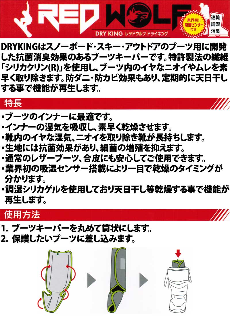 REDWOLF 【DRYKING ブーツキーパー】 コメント DRYKINGは、「シリカクリン」の消臭・除湿効果をスポーツの場でも、使えないかという思いから、スノーボード・スキー・アウトドアブーツ用に開発した抗菌消臭効果のあるブーツキーパーです。
